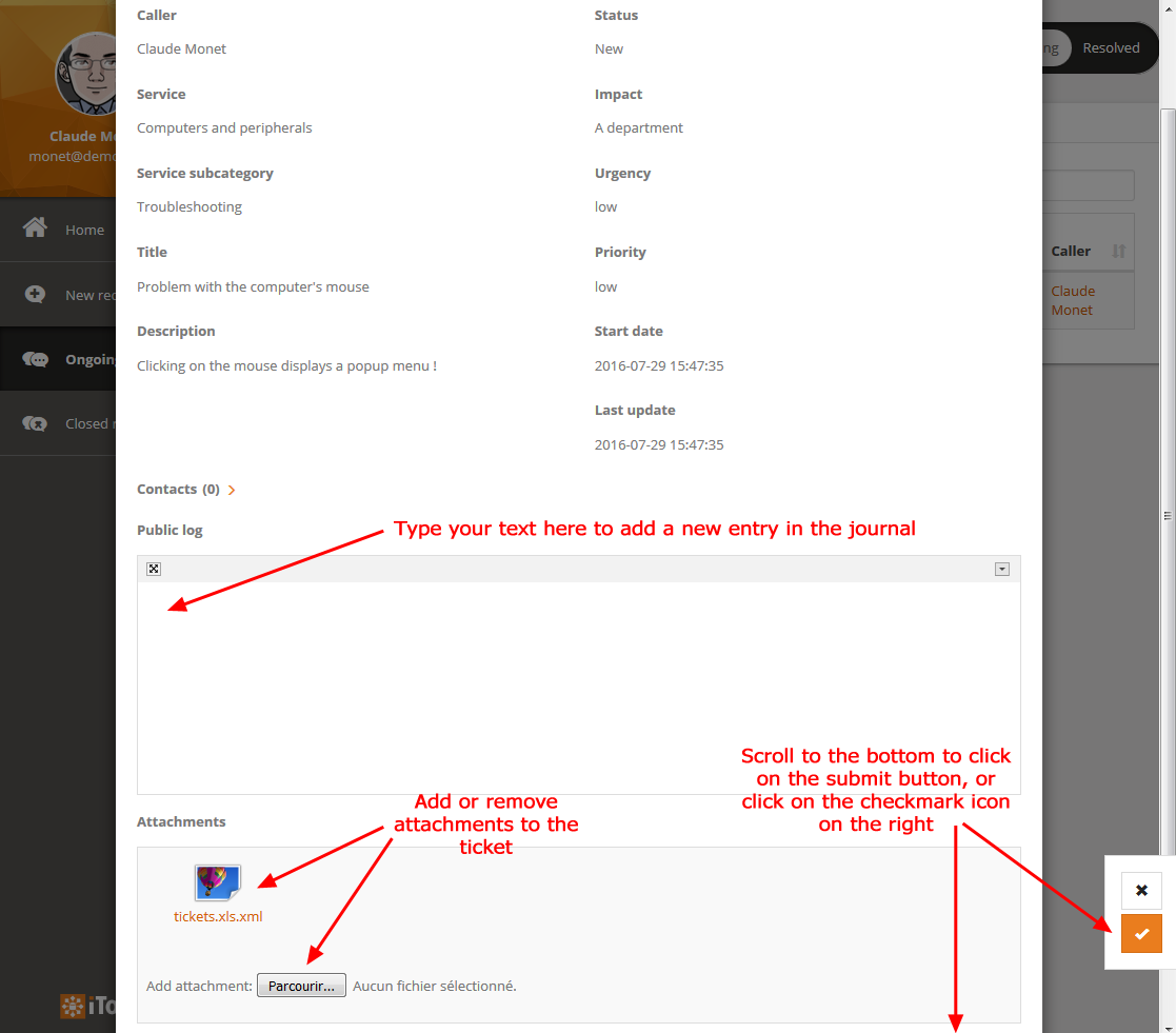 显示的表单允许您编辑日志并添加/删除附件。完成后,使用底部的“提交”按钮(或右侧的“勾号”按钮)提交您的更新。